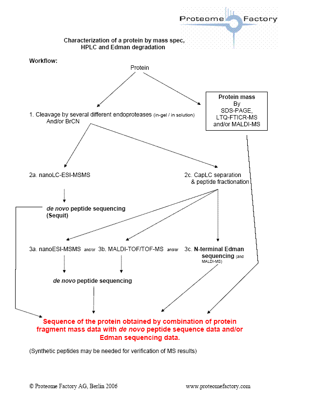 Proteome Factory offers characterization of proteins and antibodies by most modern mass spectrometric techniques in combinantion with HPLC and N-terminal peptide sequencing (Edman degradation). Proteins are digested by different endoproteases and/or chemical cleaving methods to generate overlapping peptides of the protein. Following HPLC separation of the different digests the peptides are sequenced by Edman degradation, analyzed by MALDI-MS and MSMS techniques. To ensure highest sensitivity and reliablilty Proteome Factory uses nanoLC-ESI-MSMS and/or MALDI-TOF-TOF-MS which allow de novo peptide sequencing by MSMS analysis in combinantion with de novo sequencing software SEQUiT!. By combinantion of the peptide sequence data the protein's sequence is determined.